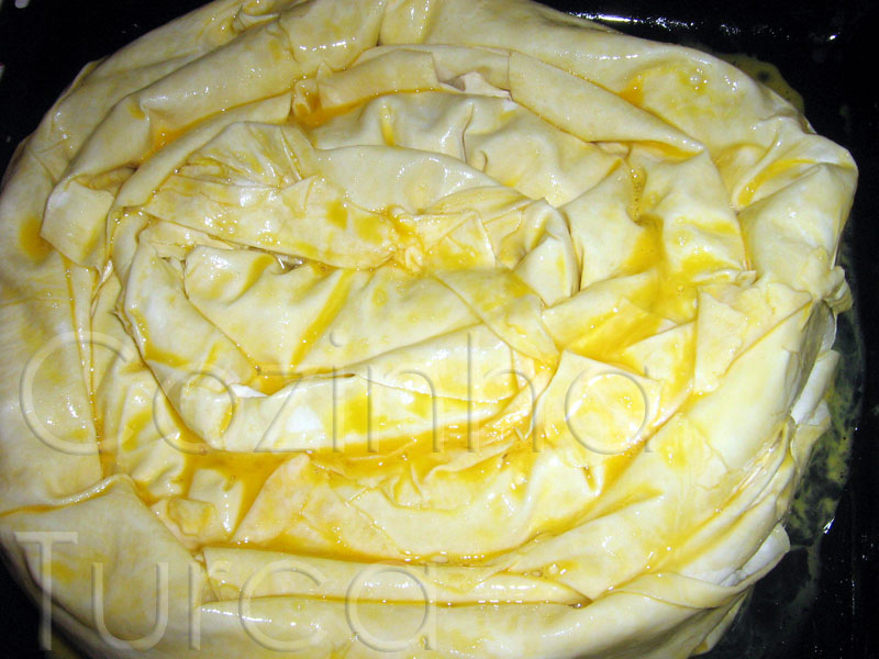 yufka) que também deve ser colocada em pequenos montes. Por fim, cubra com as partes da primeira folha de massa filo (