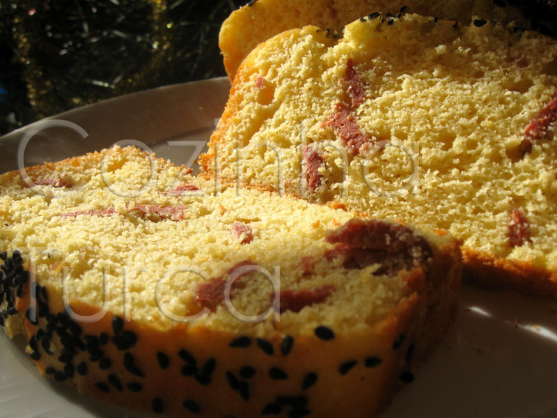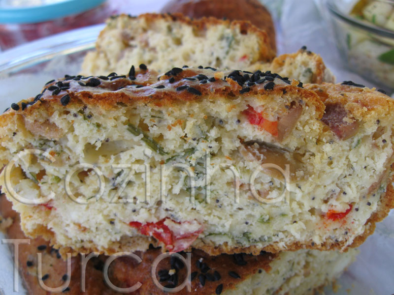 3 alhos-franceses * 3 ovos * 1 copo de iogurte turco * 1/4 copo de óleo de girassol * 1 1/2 copo de semolina (sêmola de trigo) * 1 1/2 copo de farinha de trigo * sal * pimenta preta * pimenta vermelha * 1 colher de sopa de fermento químico * cominhos pretos para polvilhar