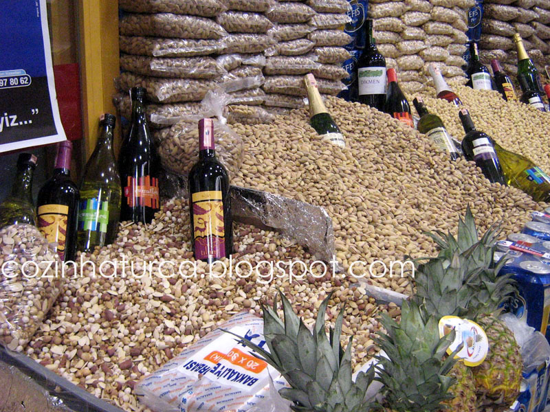 Vinhos, kuruyemiş e abacaxis em destaque num supermercado de Ancara.