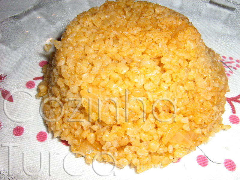 Descasque a beringela, intercaladamente, e corte-a em cubos pequenos. Coloque os cubos de beringela de molho, em água com sal, durante 15 minutos. Escorra bem a água e salteie a beringela com duas colheres de sopa de azeite. Reserve. Descasque o tomate, corte-o em cubos pequenos e salteie-os também com duas colheres de sopa de azeite. Reserve. Prepare as kaftas. Humedeça o miolo de pão num pouco de água. Misture-o com a carne picada, tempere com sal e pimenta preta e amasse bem. Forme bolas de carne muito pequenas e passe-as por farinha. Salteie-as em duas colheres de sopa de azeite. Reserve. Salteie o arroz em duas colheres de sopa de azeite. Adicione água e tempere com sal e pimenta preta. Cozinhe o arroz até a água evaporar. Retire do lume e aguarde cerca de dez minutos. Passe o arroz para um prato de servir e misture-o com as kaftas, beringela e tomate. Sirva quente.