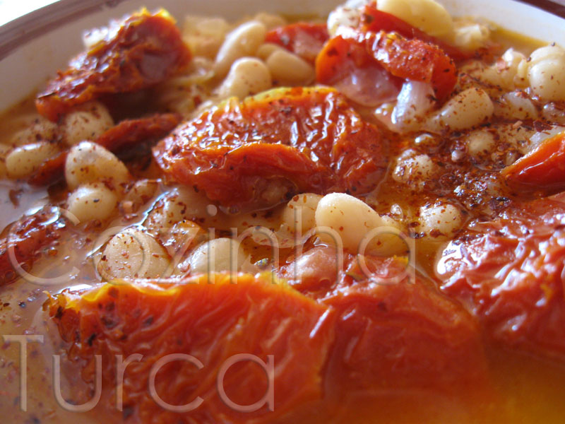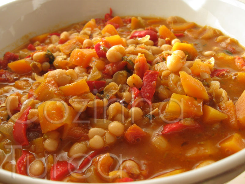 Coza o feijão e reserve. Salteie a cebola e os dentes de alho finamente picados no azeite. Adicione a cenoura e o pimentão vermelho cortados em pedaços pequenos e a polpa de tomate e continue a saltear durante cerca de dez minutos. Junte o feijão cozido, os temperos e o sumo de limão e cubra com água. Cozinhe em lume brando durante cerca de 20 minutos. Sirva como entrada, frio ou à temperatura ambiente, polvilhado com salsa picada. Pode também servir quente como prato principal.