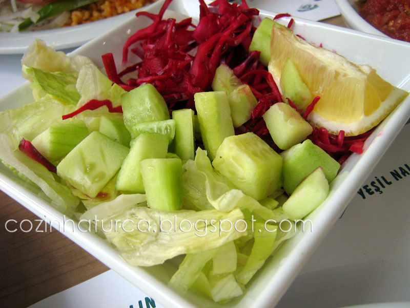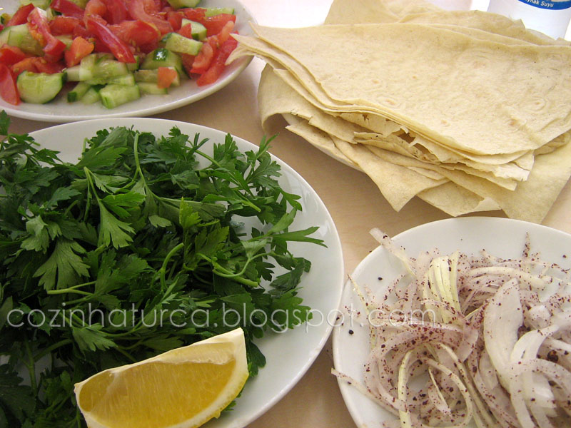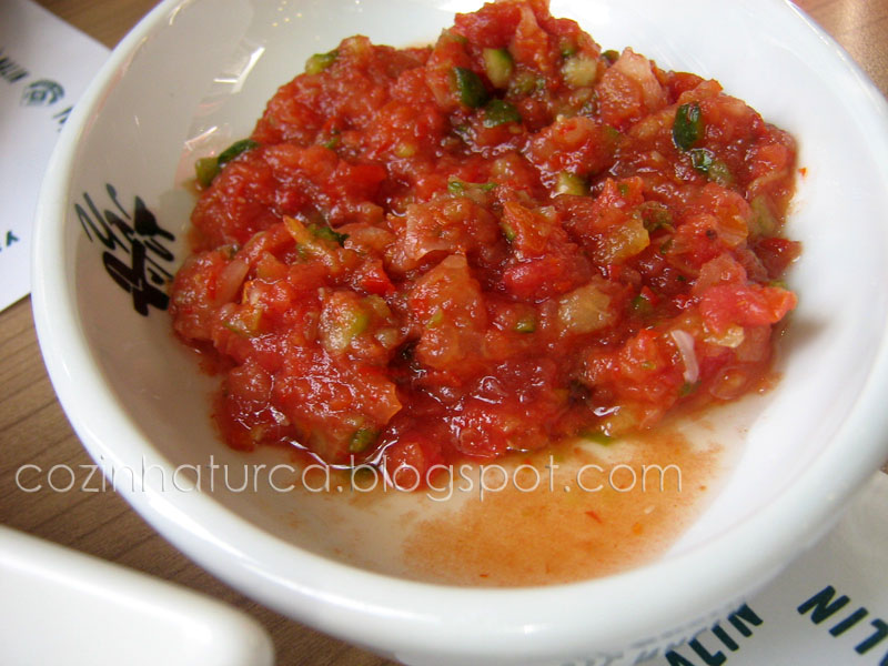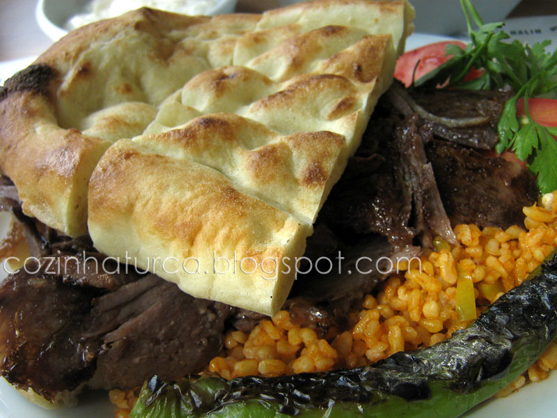 köfte (rolinho de carne picada). A carne é regada com molho de tomate e pode ser também regada com manteiga derretida muito quente. A guarnição com manteiga derretida é geralmente feita à vista do cliente, que pode optar por não querer ou solicitar maior ou menor quantidade. Com ou sem molho de manteiga vale a pena experimentar.